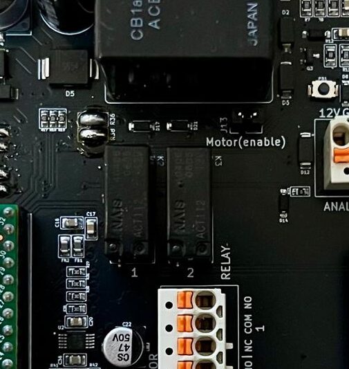Die Bücke bei On/off schaltet das Board ein – das Schwarze Relais zieht dann an und der Motorcontroller bzw der 12 V Ausgang hat Strom.